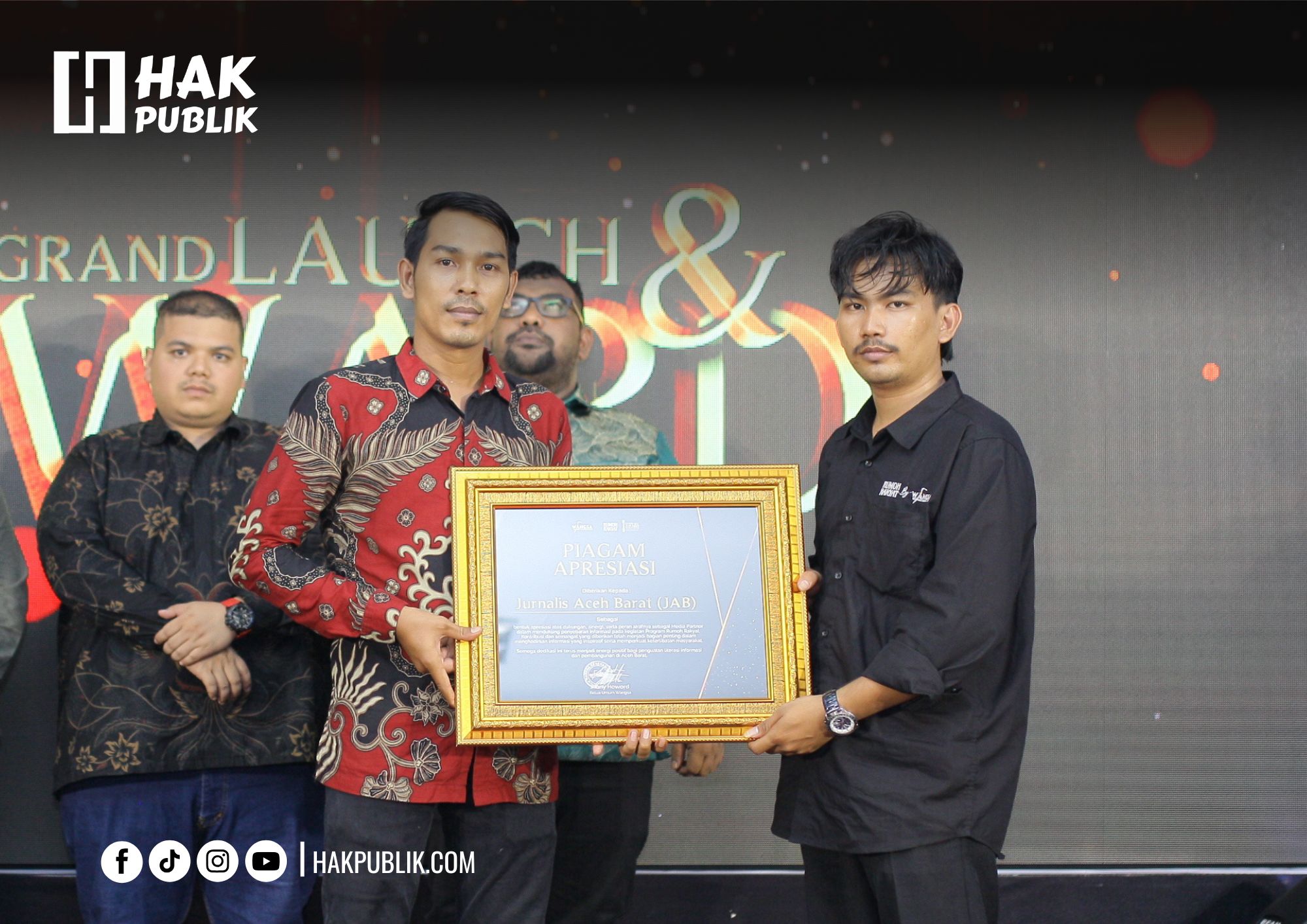 Meulaboh, Aceh Barat – Jurnalis Aceh Barat (JAB) menerima Piagam Apresiasi dari Yayasan Wahana Generasi Aceh (WANGSA) pada malam puncak Luminary Award WANGSA 2025 di Desa Langung, Kecamatan Meureubo. Penghargaan ini diberikan sebagai pengakuan atas dukungan, sinergi, dan peran aktif JAB dalam menyebarluaskan informasi seputar Program Rumoh Rakyat, pusat pendidikan kritis dan literasi kreatif yang diinisiasi WANGSA (26/09/2025).
